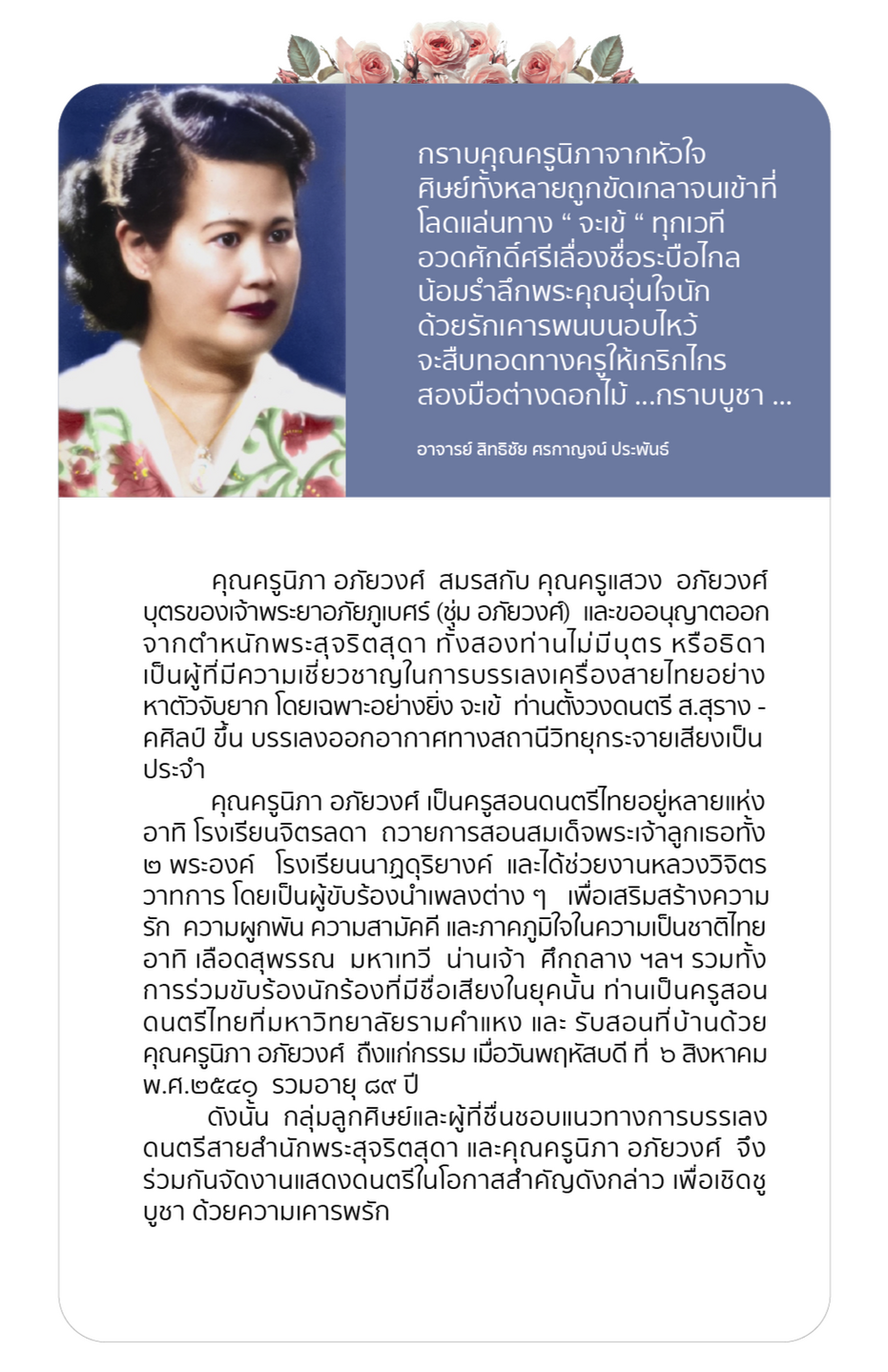 เมื่อตั้งใจที่จะจัดงาน “เสนาะเสียงดนตรีจากตำหนัก เคารพรักพระคุณครูมิรู้สิ้น” เพื่อร่วมรำลึก สืบสาน เนื่องในโอกาสครบรอบ ๑๓๐ ปี ชาตกาล พระสุจริตสุดา และ ๑๑๗ ปี ชาตกาล คุณครูนิภา อภัยวงศ์ จึงขอนำเดี่ยวจะเข้ เพลงหอมหวล ๓ ชั้น ออกเผยแพร่ เพื่อเป็นการเชิดชูบูชา คุณครูแสวง และ คุณครูนิภา อภัยวงศ์ ปรมาจารย์ที่มีฝีมือเป็นเลิศด้านจะเข้ ท่านเป็นคู่สามี ภรรยา ที่ทำนุบำรุงดนตรีไทยร่วมกัน ดังข้อความไว้อาลัยที่คุณครูนิภา ฯ เขียนไว้ในหนังสือ อนุสรณ์งานฌาปนกิจศพ คุณครูแสวง อภัยวงศ์ ณ เมรุวัดธาตุทอง เมื่อวันพฤหัสบดี ที่ ๒๓ พฤศจิกายน ๒๕๑๕ ความว่า ..... โดยเหตุที่มีรสนิยมต้องกัน โดยเฉพาะในด้านการดนตรีไทย จึงดลใจให้มีชีวิตอยู่ร่วมกันเป็นเวลา ๔๐ ปี ตลอดระยะเวลานี้ ได้ร่วมมือร่วมใจกันมุ่งบำรุงสร้างฐานะ ด้วยการเทอดทูนส่งเสริมวิชาการดนตรีไทยอันเป็นสมบัติล้ำค่าและศิลปประจำชาติ .....